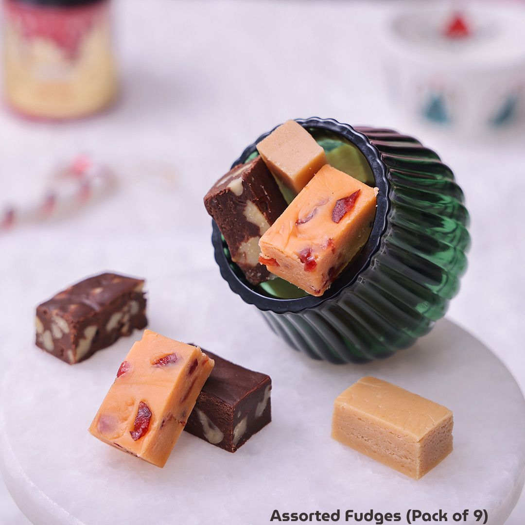 Assorted Fudges: Decadent squares of Chocolate Walnut, Vanilla, and Orange Cranberry fudges (3 pieces each).