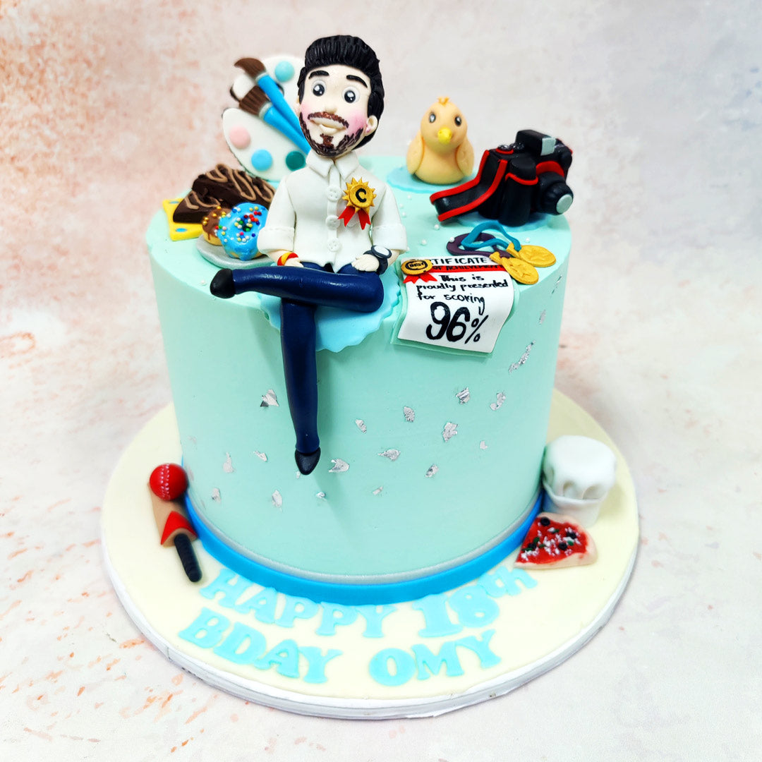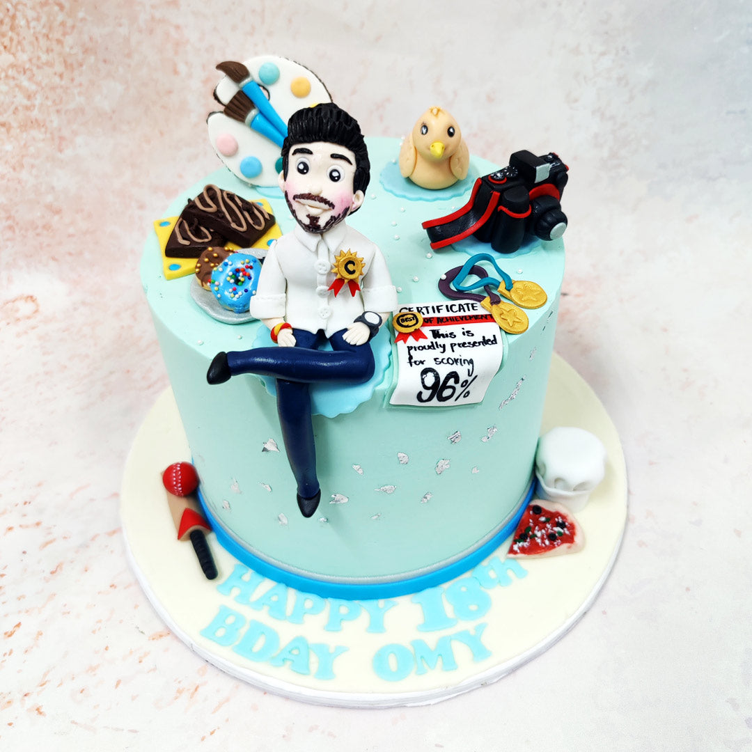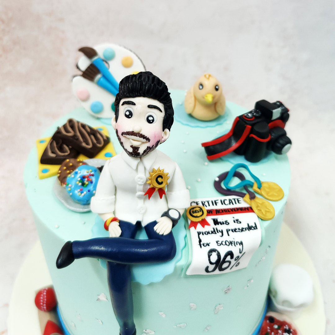 This celebratory Achievement Cake brilliantly captures academic triumph with a playful assortment of meticulously crafted elements. The soft mint-blue backdrop of this Artist Cake serves as the perfect canvas for a collection of personalised achievements. Centred proudly is a hand-sculpted figurine in academic white, complete with a golden achievement medal—a nod to the time-honoured tradition of recognising scholarly excellence.
