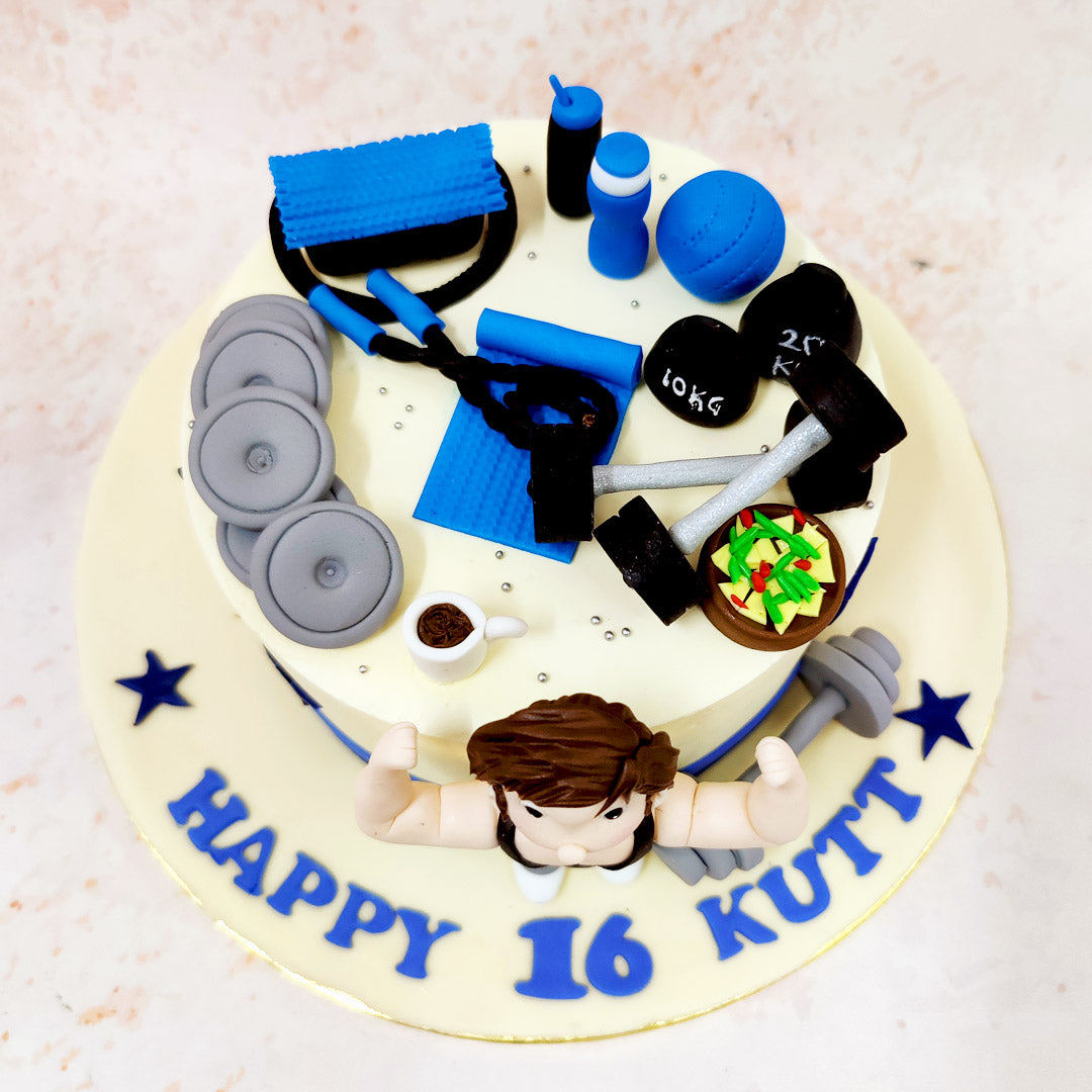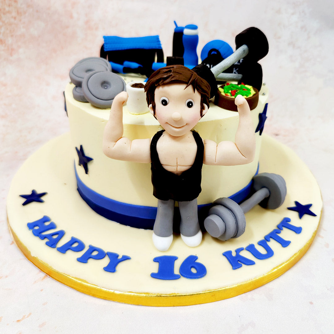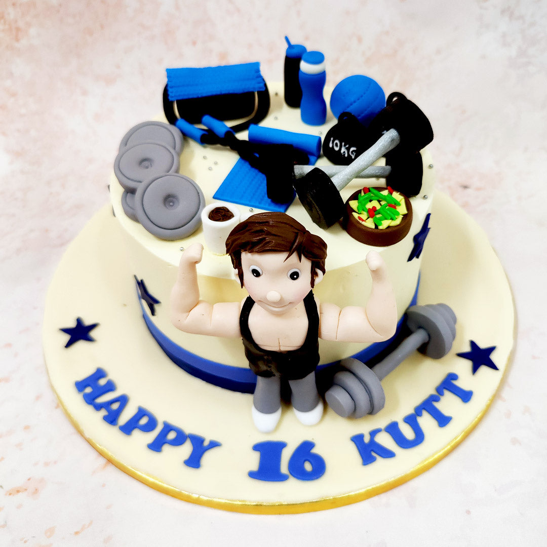 This Gym Lover Cake showcases a delightful fusion of fitness enthusiasm and artistic craftsmanship, perfectly capturing the essence of a gym enthusiast's passion. The centrepiece of this Fitness Cake features a charming figurine flexing with enthusiasm, dressed in classic workout attire, complete with a sleeveless top that emphasises the celebration of physical fitness.